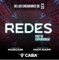 REDES- Viví tu Experiencia -Un show impactante. Un espectáculo inclasificable. Mucho más que teatro. Mucho más que virtualidad. Un reality show que juega con la vanguardia.REDES interpela la web. REDES es una puñalada de realidad.REDES son tus emociones online.José María Muscari, Mati Napp y Paola Luttini, el equipo creativo detrás de SEX, presenta ahora su nuevo espectáculo, REDES, en donde la potencia del talento se mezcla con la influencia virtual para divertirte y emocionarte; y para potenciarte y ayudarte a pensar el hoy y el mañana. Protagonizado por Inés Estévez y con un elenco integrado por las y los referentes más interesantes de las redes sociales;